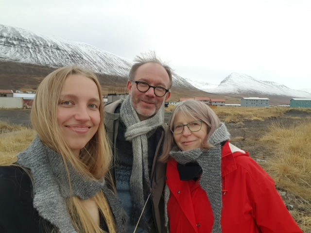 Mara, Anno and me in the scarves I designed and knitted. Inspired by the mountains by the fjords.
