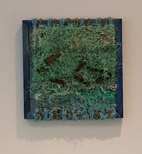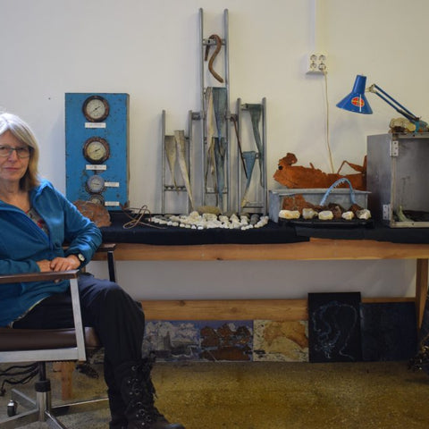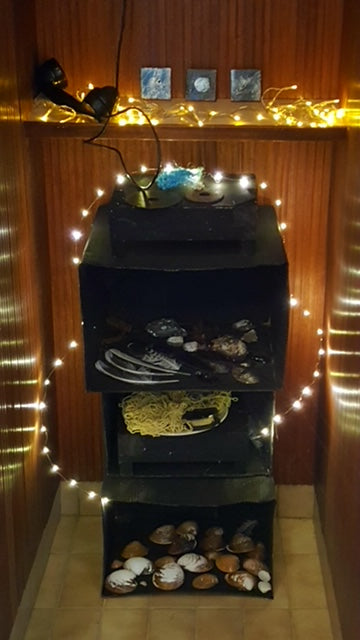 Shells, found objects and mini canvasses displayed in Kaffi Klara, Ólafsfjördur